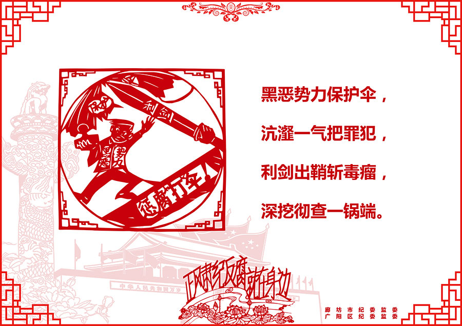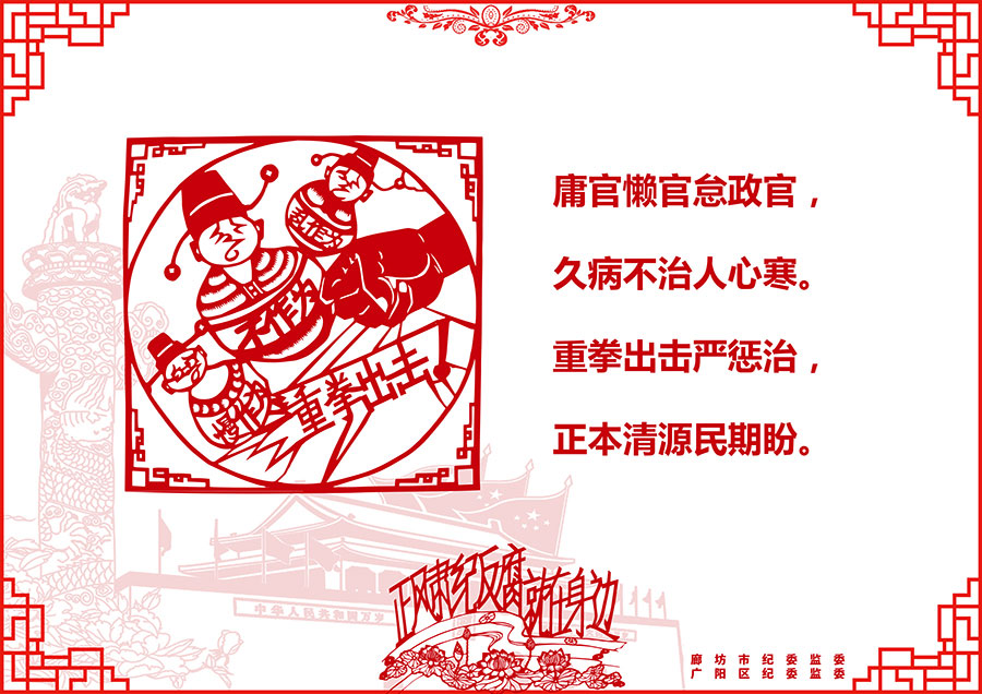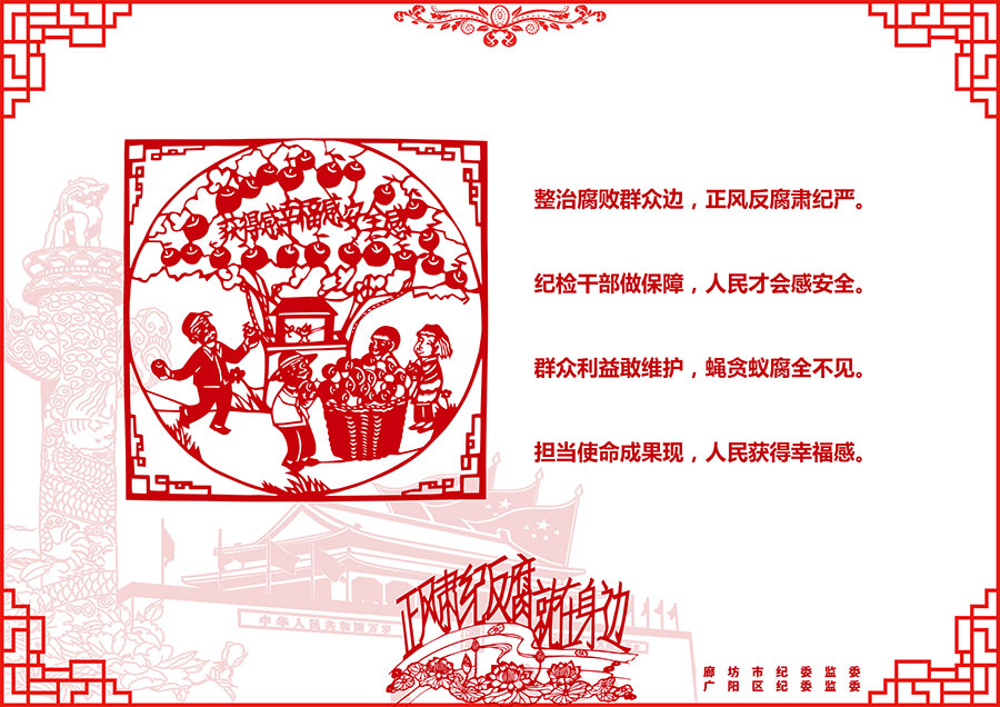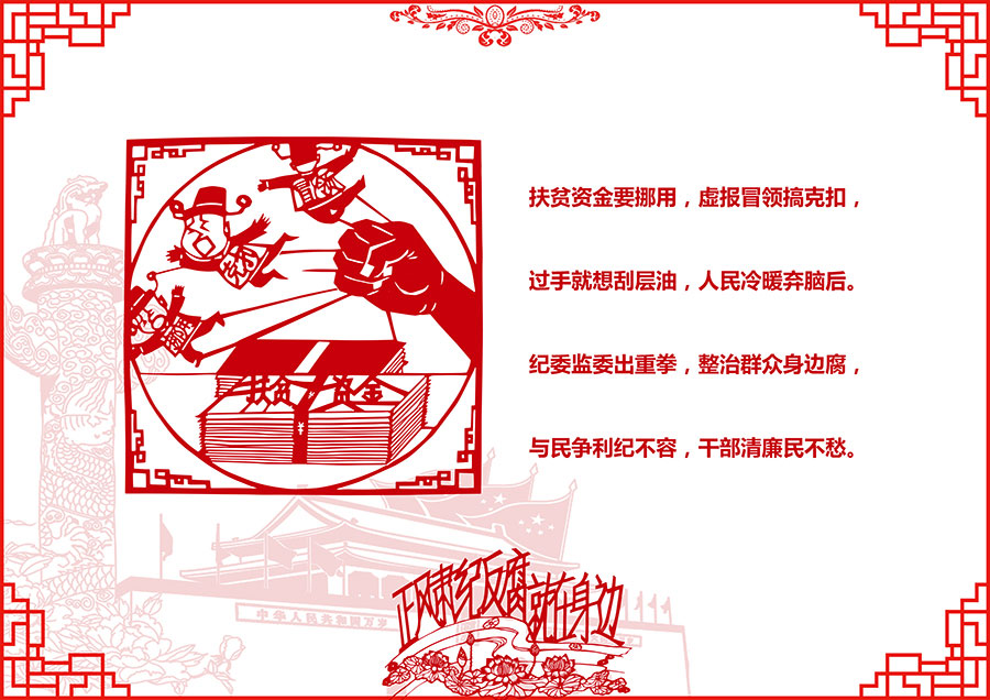发生在群众身边的腐败和作风问题令人深恶痛绝,侵蚀人民群众的获得感、幸福感和安全感。近日,廊坊市纪委监委、广阳区纪委监委邀请剪纸艺术爱好者,用手中的剪刀和一幅幅作品,表达了对整治群众身边腐败和作风问题的拥护和期盼,教育引导广大党员干部扬清风、树正气。这些作品既揭露了当前群众身边腐败和作风问题的主要表现形式,又反映了专项整治的主要任务。