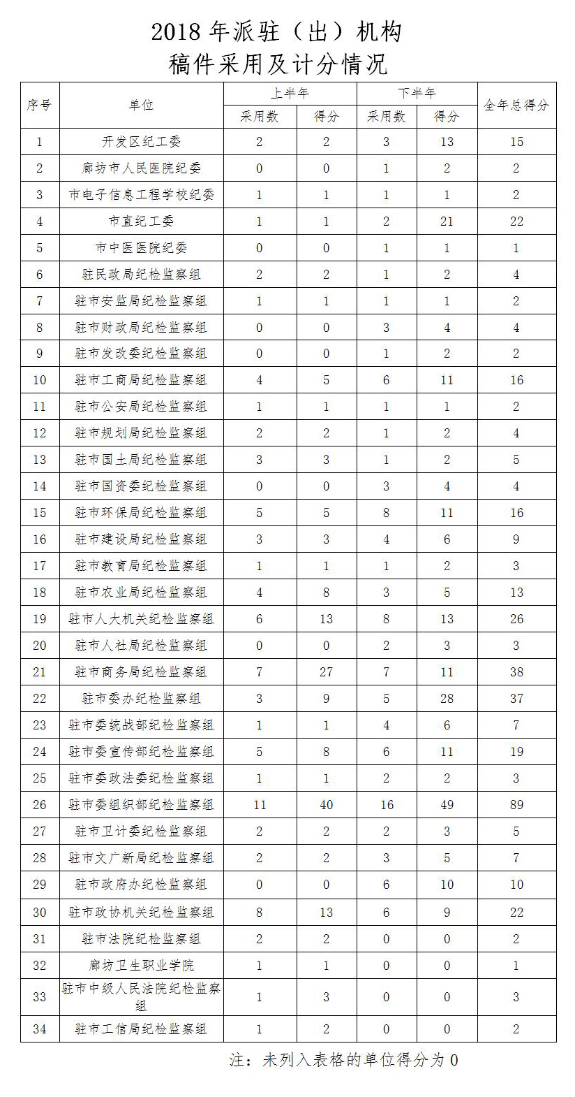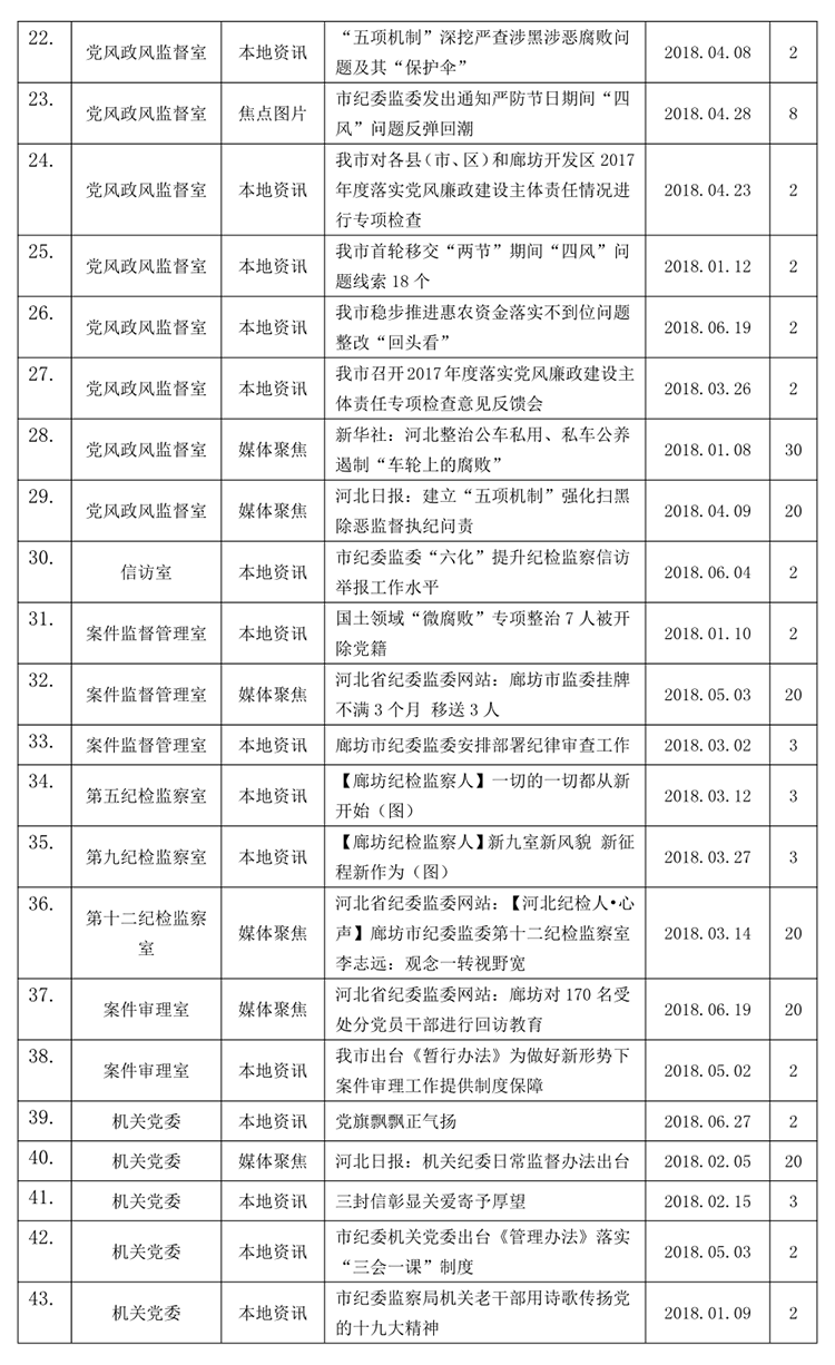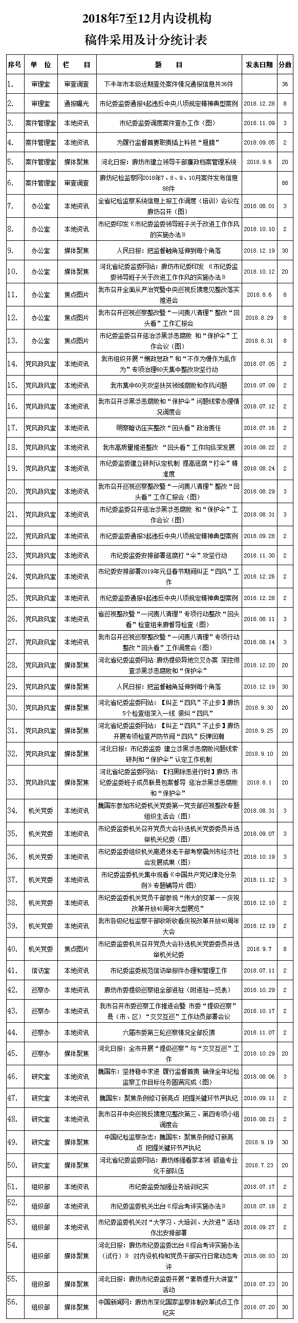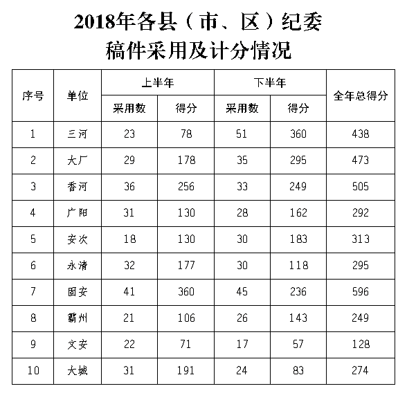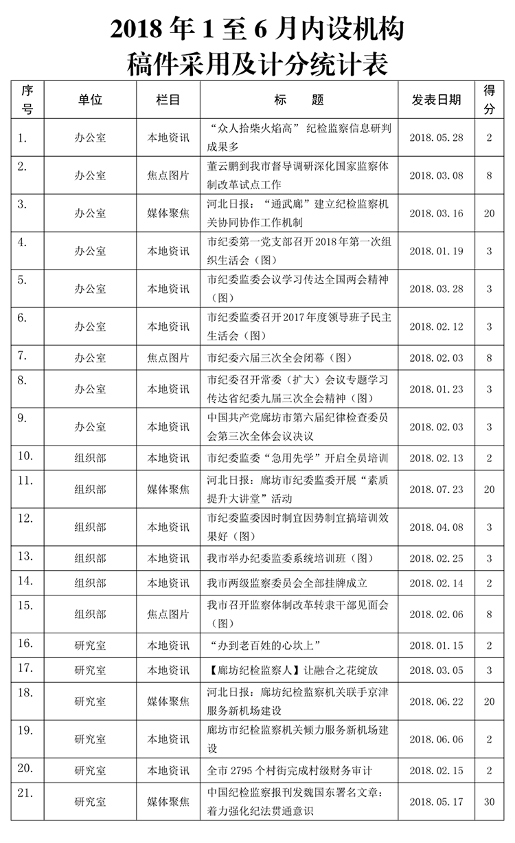 根据《中共廊坊市纪委办公室关于印发<廊坊纪检监察网稿件报送采用考评办法(试行)>的通知》要求,经统计汇总,现将2018年廊坊纪检监察网稿件采用情况予以公布。