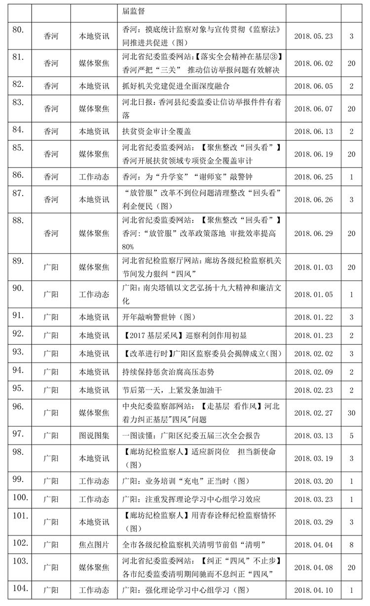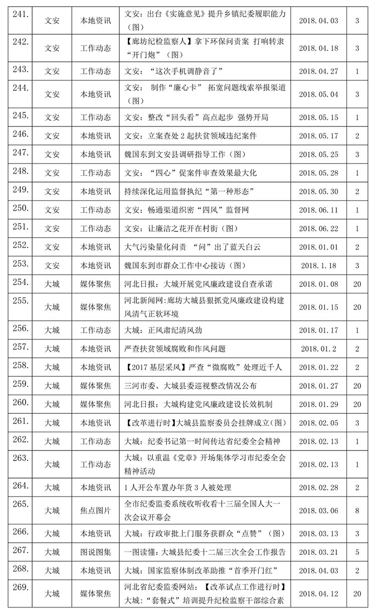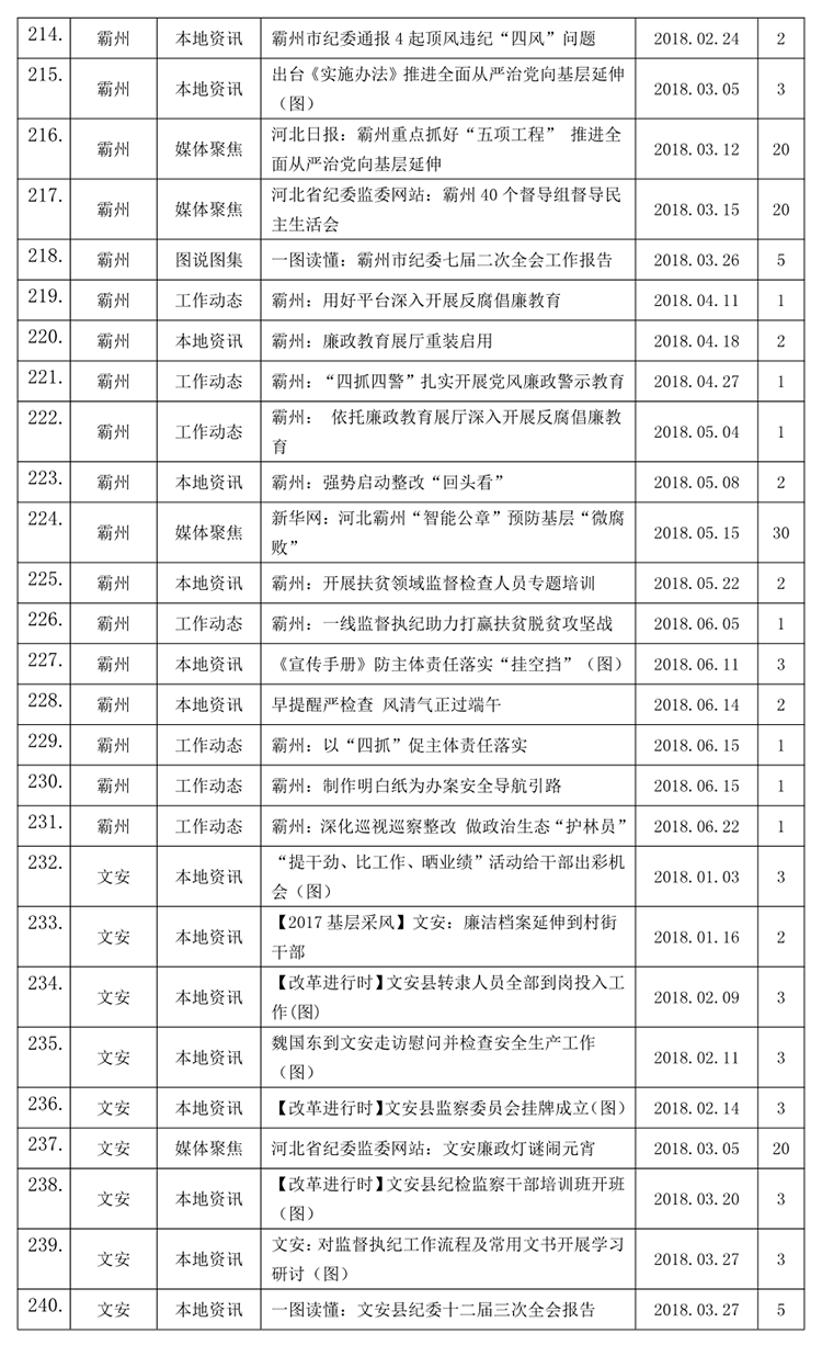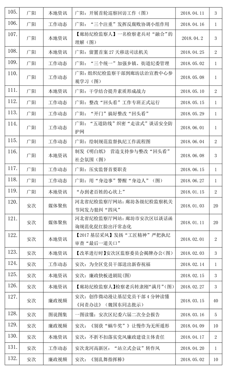 根据《中共廊坊市纪委办公室关于印发<廊坊纪检监察网稿件报送采用考评办法(试行)>的通知》要求,经统计汇总,现将2018年廊坊纪检监察网稿件采用情况予以公布。