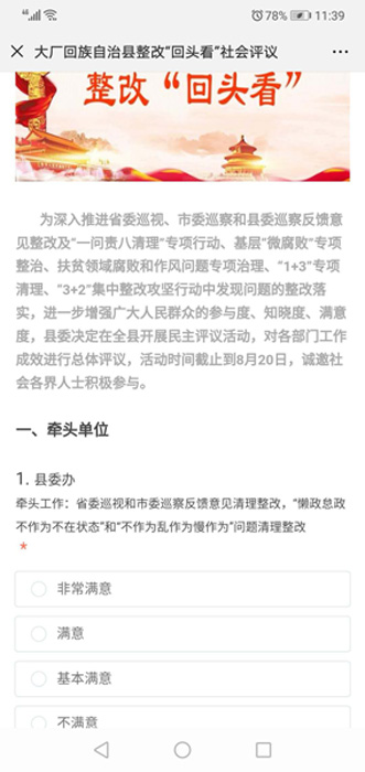 8月14日,一则“大厂整改‘回头看’干得怎么样?请您发表意见......”的网络问卷调查,传遍大厂县干部群众的朋友圈。截至目前,已经收集了1600余份调查数据。