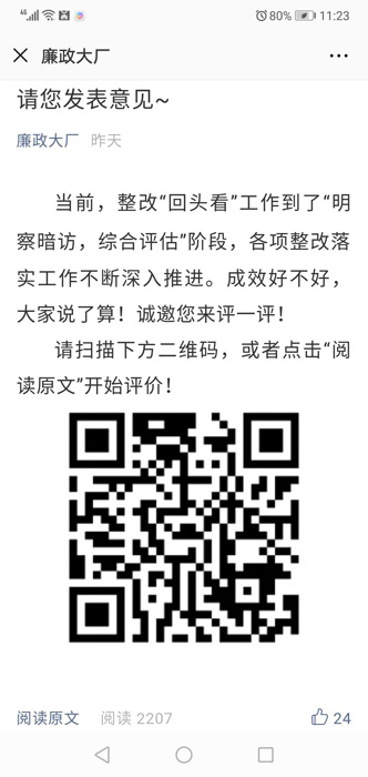 当前,整改“回头看”正处于“明察暗访、综合评估”阶段,大厂县在开展综合评估的过程中,把群众满意不满意作为评估结果重要参考,围绕76个部门工作落实情况,制作评议问卷,通过廉政大厂微信、京东新城网等载体发布,向社会各界广泛开展满意度调查。该调查将持续一周时间,8月20日完成数据收集,相关数据纳入总体评估结果。