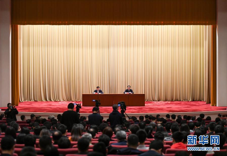 3月16日,中央宣讲团成员、中央党史和文献研究院院长曲青山(右)在报告会上作宣讲报告。新华社记者陈晔华摄