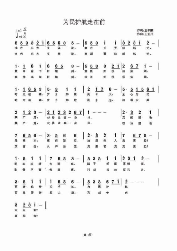 这是三河市纪检监察干部王亚兴、王辛鹏针对学习宣传贯彻党的十九大精神创作的一首廉政歌曲——《为民护航走在前》,同时还创作有廉政歌曲《金秋》。《为民护航走在前》体现了作者对祖国的热爱和作为一名纪检监察干部的自豪,以及惩治贪污腐败的坚定信念;《金秋》则委婉细腻地描述了对党的十九大和习近平总书记重要讲话精神的赞颂之情。